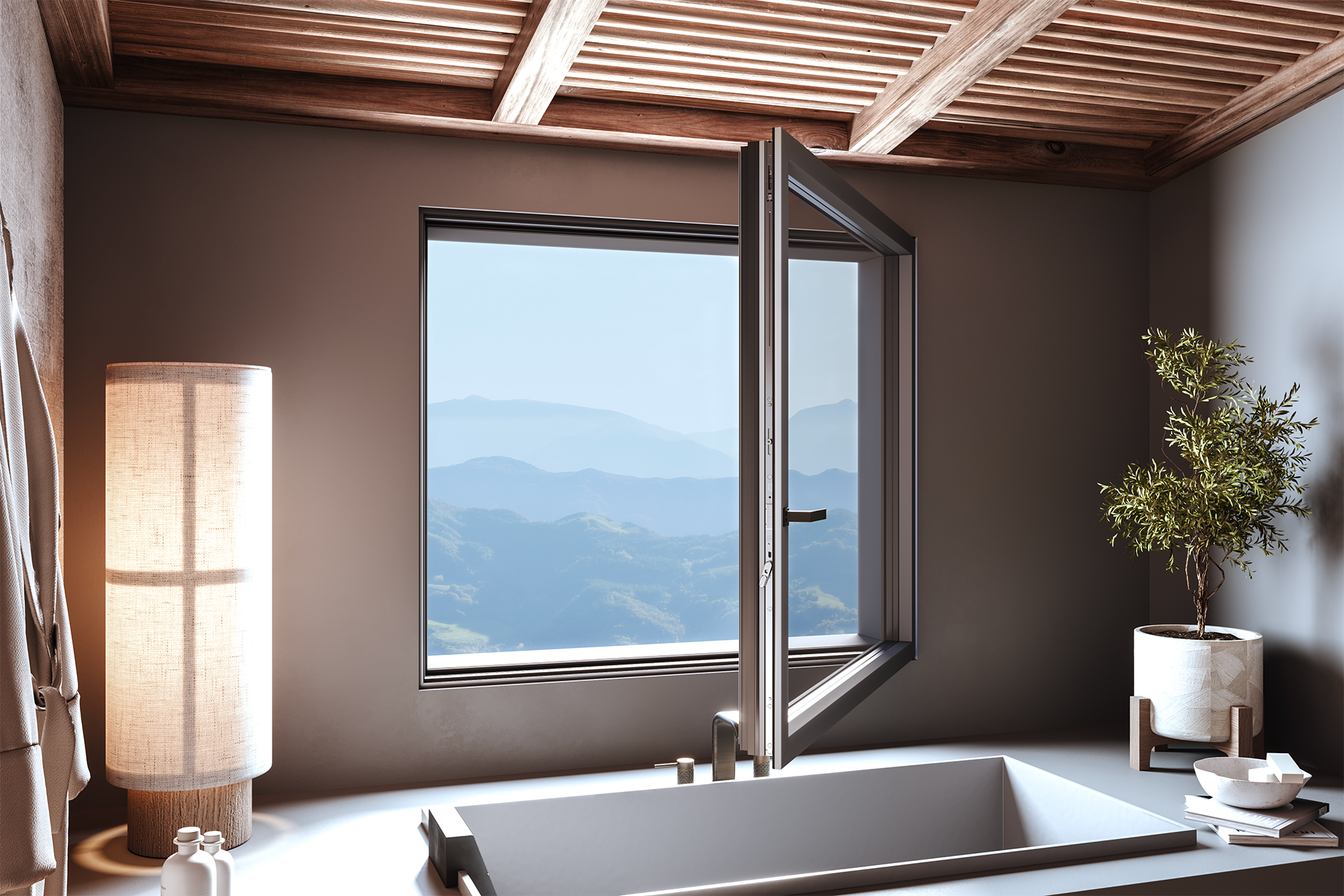 La finestra Climax in legno-alluminio offre un design moderno e minimalista, caratterizzato da un effetto rasomuro interno e complanare esterno, che si integra
