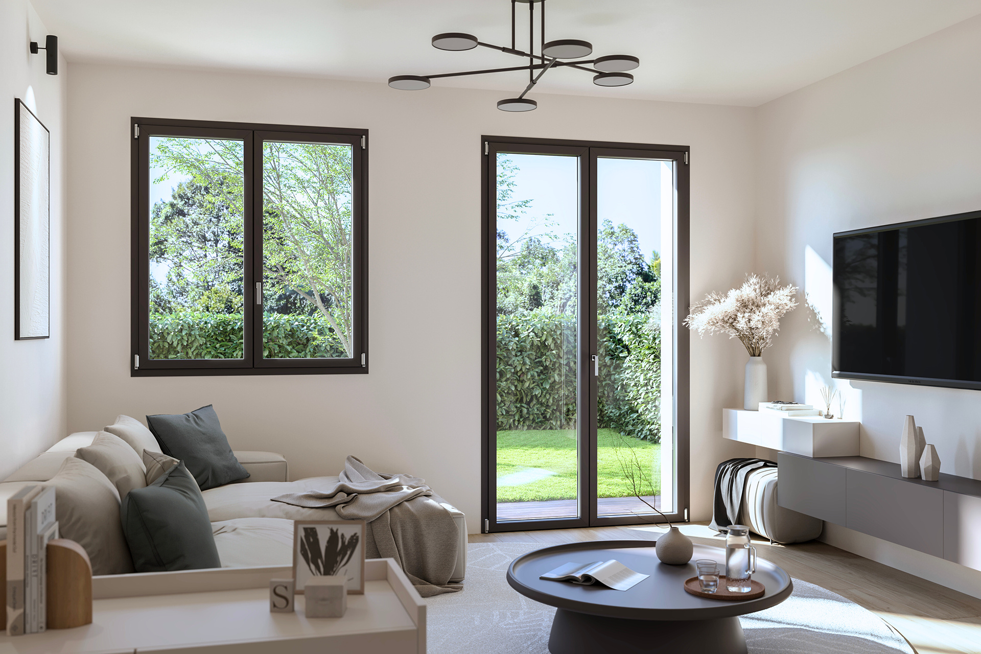 Composto da finestre a battente e una porta finestra, si caratterizza per dettagli raffinati e finiture contemporanee. presenta il telaio in battuta e cerniere a vista