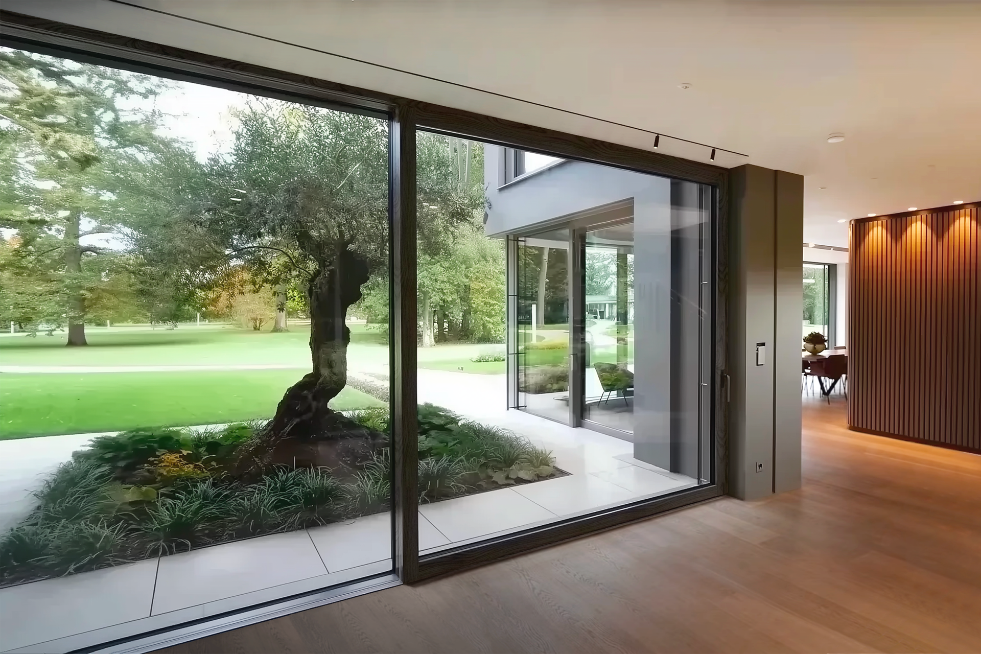 Il sistema può essere installato con il profilo incassato nel muro, creando un design minimalista che riduce la visibilità dei profili e massimizza la trasparenza tra interni ed esterni.
