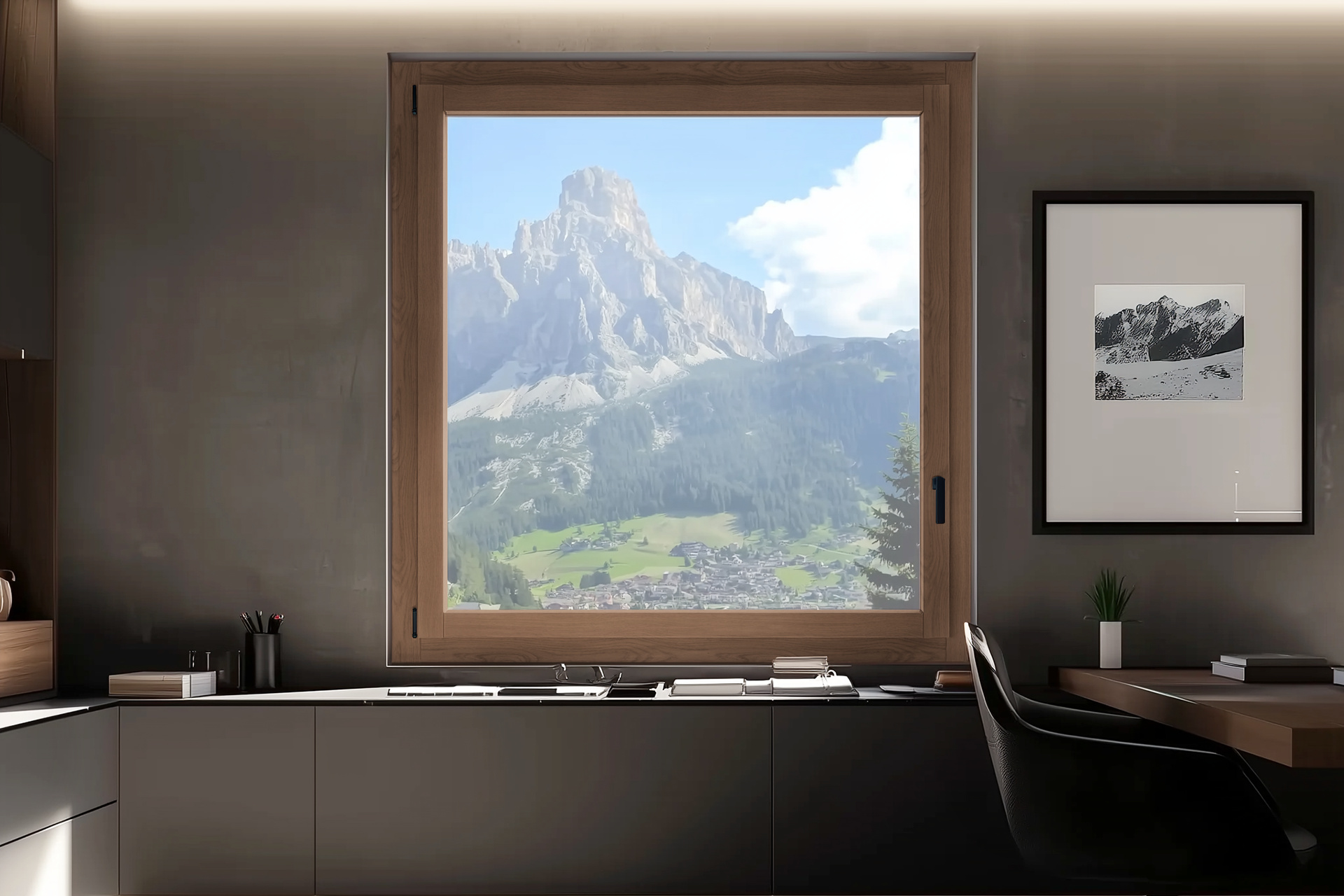 La finestra è caratterizzata da un design moderno e lineare, con il telaio in piano che si integra perfettamente con l'estetica dell'ambiente. Il suo colore richiama il legno corteccia, offrendo una calda sensazione naturale e un tocco elegante. La cerniera è a vista, contribuendo a un look solido e funzionale senza sacrificare l'estetica. La maniglia nera si distingue per il contrasto deciso con la tonalità del telaio, aggiungendo un dettaglio contemporaneo e raffinato.