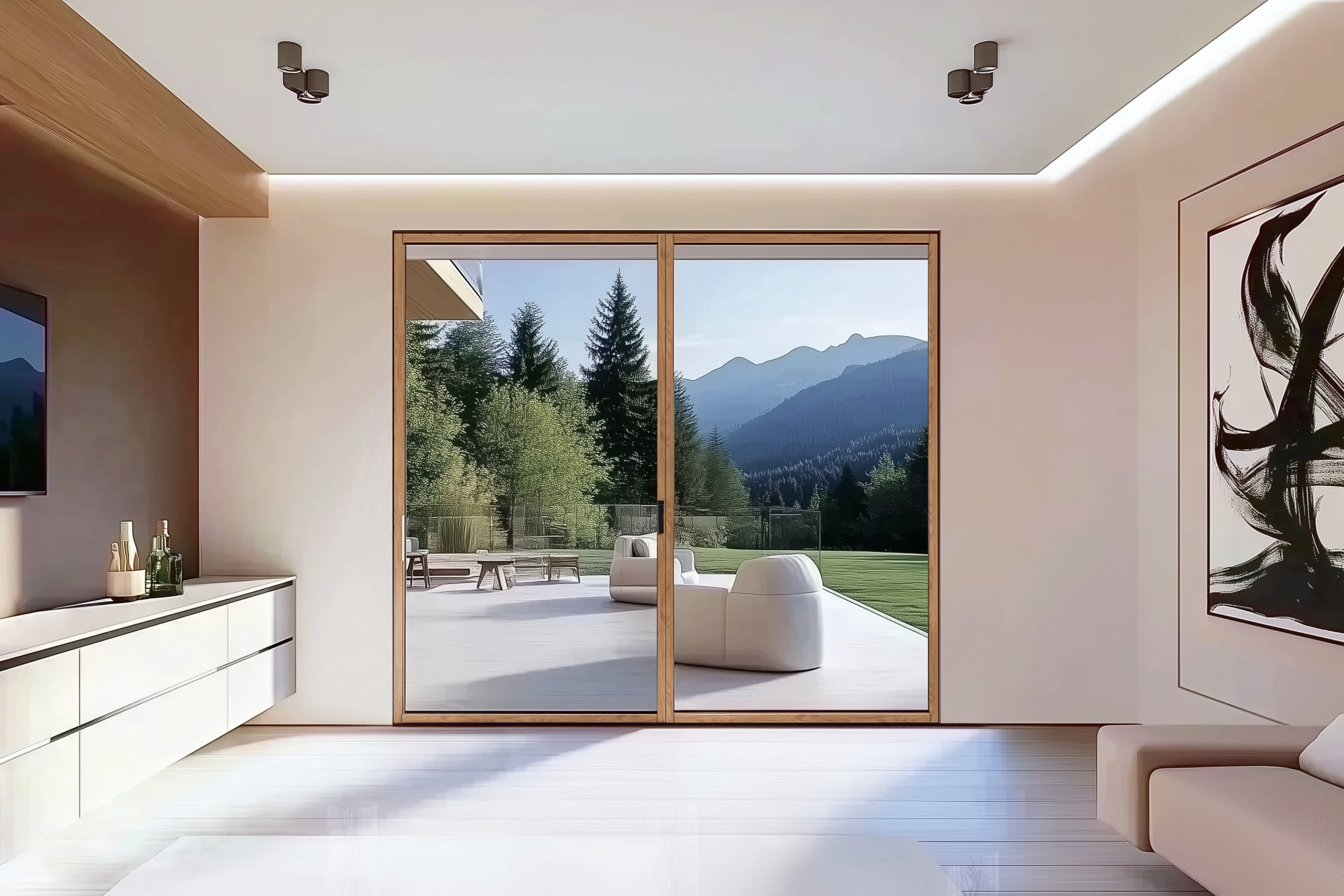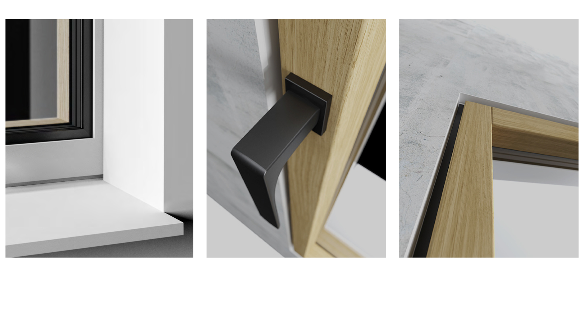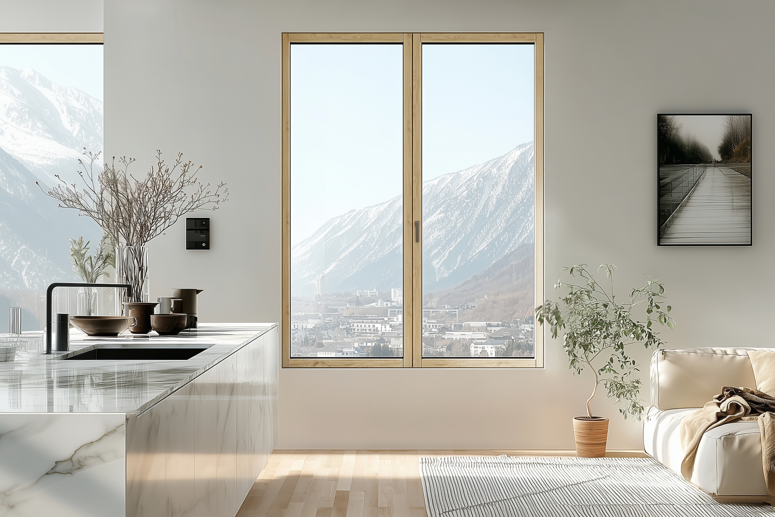 Gli infissi in legno-alluminio, dal design minimale, offrono eccellenti prestazioni termoacustiche grazie al legno interno che isola dal calore, dal freddo e dai rumori